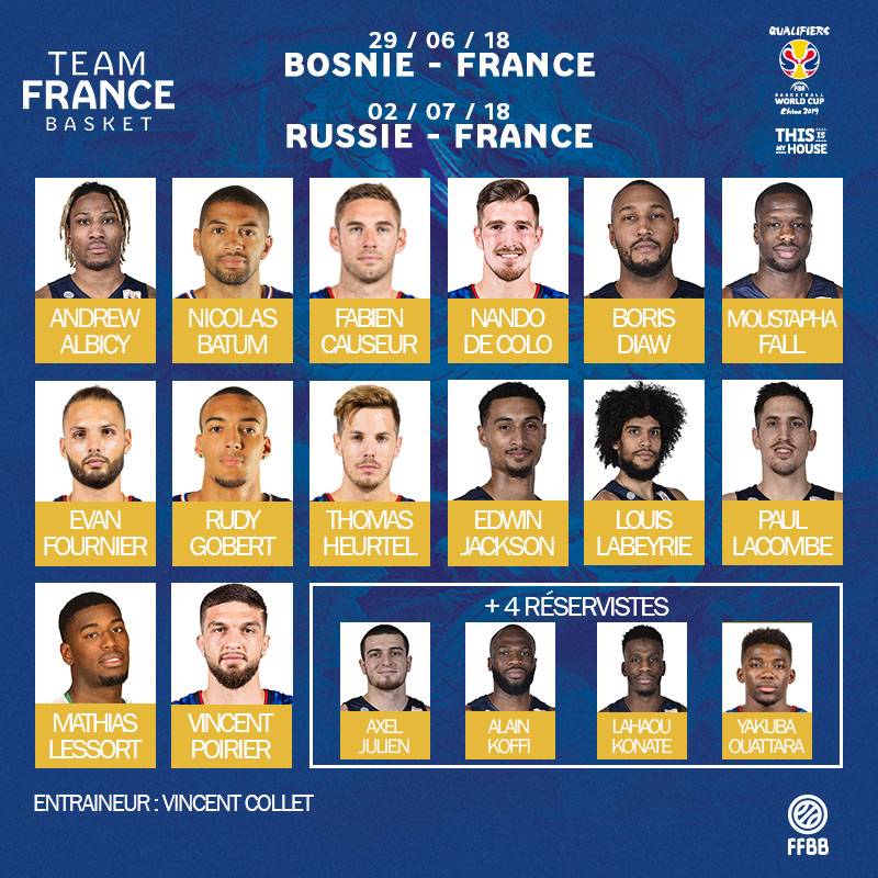 Vincent Collet (entraîneur de l’Équipe de France masculine) et Patrick Beesley (General Manager du Team France Basket) ont dévoilé ce vendredi la liste des joueurs appelés en bleu pour disputer les deux rencontres de qualification à la Coupe du Monde 2019 en Bosnie-Herzégovine le vendredi 29 juin et en Russie le lundi 2 juillet.