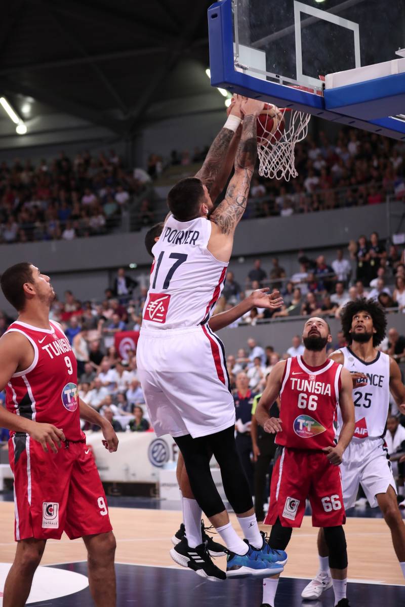 Une perspective qui n’effraie pas le moins du monde Théo Maledon. Le partenaire d’entraînement s’est mué en troisième meneur de luxe et à la pause, le benjamin du groupe s’était fendu de 8 points en 5 minutes, contribuant à faire exploser des champions d’Afrique incapables de gérer la pression defensive. La Tunisie encaissait un 33-13 en dix minutes, impactée au rebond et débordée par la qualité du banc français. Il n’y aura pas plus de conclusion à tirer de la large victoire toulousaine que de la défaite paloise, mais elle a délivré quelques motifs de satisfaction. Parmi eux, la rentabilité de Vincent Poirier en relais de Gobert. Le futur pivot des Celtics a été l’attraction du début de deuxième mi-temps, livrant un duel divertissant à son futur adversaire en NBA, Salah Mejri. Postérisé d’un magistral dunk main gauche puis trompé par un bras roulé, le vocalnique joueur des Mavs en a fait une affaire personnelle et relancé quelque peu ses troupes. Pas de quoi constituer la moindre menace pour des Bleus appliqués sur leur attaque de zone et tranchants en contre-attaque.