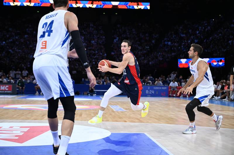 Dans une Accor Arena qui a rendu un vibrant hommage à Boris Diaw, honoré, en compagnie de sa maman Elisabeth Riffiod, pour leurs 247 sélections en Equipe de France, les Tchèques ont reproduit leur départ en boulet de canon. Un 2-10 en à peine plus de deux minutes jetait un froid dans la salle et si un Guerschon Yabusele tantôt en mode panzer, tantôt en mode sniper, alimentait la marque, les Bleus manquaient clairement de liant collectif, se lançant trop souvent dans des raids individuels peu concluants. Le chantier offensif évoqué mardi en conférence de presse est encore une réalité et le 5/18 aux tirs du premier quart-temps l’a rappelé. Le voyage jusqu’à l’EuroBasket ne sera pas un long fleuve tranquille pour une équipe largement renouvelée (6 vice-champions olympiques seulement) et le tangage du bateau bleu a été d’autant plus inquiétant que les hommes de Ronen Ginzburg ont par deux fois porté leur avantage à +10, profitant d’une adresse tricolore en en berne, qui contrastait avec le festival de Vojtech Hruban. Le joueur emblématique de Nymburk a démontré pourquoi il est aujourd’hui le meilleur marqueur de l’histoire de la BCL se fendant de 14 points à la pause.