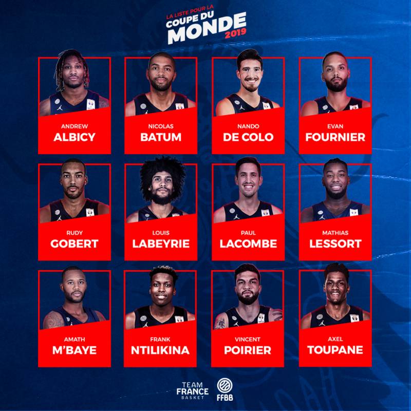 L’entraîneur de l’Équipe de France masculine de basket, Vincent Collet, a annoncé, ce mardi 27 août, à Shenyang (Chine), les noms des 12 joueurs qui participeront à la Coupe du Monde 2019. Les meneurs Théo MALEDON (1,91 m, 18 ans, 5 sélections) et Elie OKOBO (1,90 m, 21 ans, 8 sélections) sont les derniers joueurs non retenus pour la Coupe du Monde.