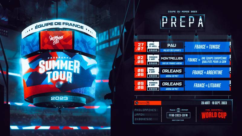 Les Bleus seront réunis en stage à partir du lundi 24 juillet à Pau. Après un premier match face à la Tunisie le jeudi 27 juillet au Palais des Sports (7 200 spectateurs), les Tricolores se rendront à la Sud de France Arena de Montpellier (8 500 spectateurs) pour y affronter, le mercredi 2 août, le Monténégro. Les joueurs de Vincent Collet termineront leur préparation, en France, par deux rencontres (Lundi 7 et mercredi 9 août) face au Vénézuéla puis la Lituanie à la Co’Met Arena d’Orléans. Inaugurée en janvier, la nouvelle salle de 10 000 places, promet une très belle expérience. Les Français se rendront ensuite en Lituanie pour jouer leur 5e rencontre de préparation, le vendredi 11 août. L’Équipe de France s’envolera ensuite vers l’Asie, le lundi 14 août, afin de disputer un dernier tournoi de préparation (lieu à déterminer), avant la Coupe du Monde.